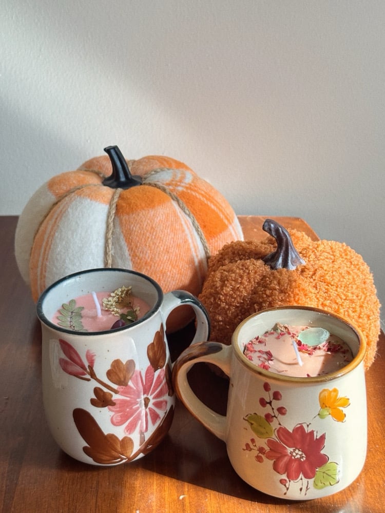 notes of clove, cinnamon, nutmeg, pumpkin puree, maple cream sugar vanilla snd brown sugar soy wax in vintage floral mug