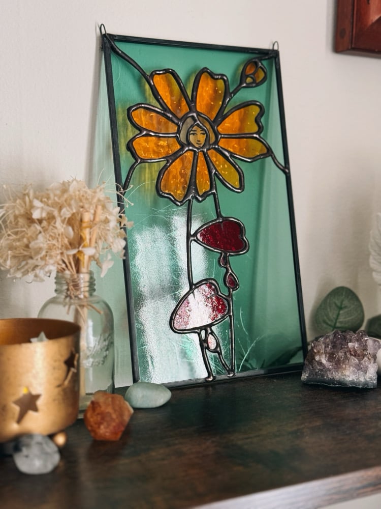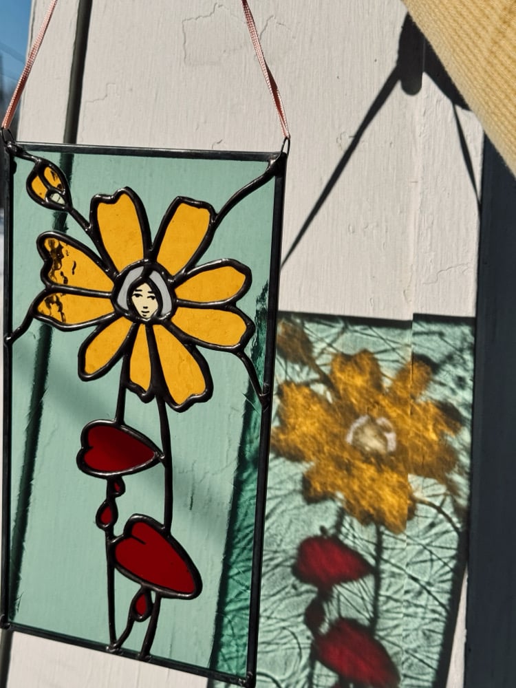 One of our favorite pieces ever! The textured turquoise background makes the red in the hearts pop, and makes for fun streaky refractions in the light! The faces were painted on with an acrylic paint.